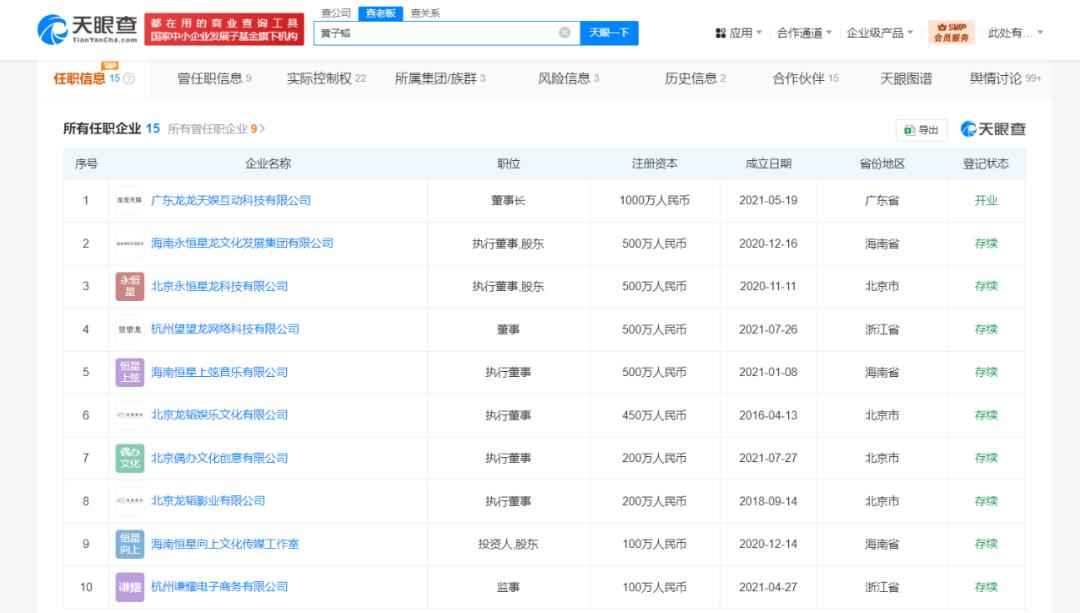 此外,天眼查App显示,黄子韬与北京龙韬影业有限公司、北京龙韬娱乐文化有限公司等15家企业有关联,均处于存续状态。