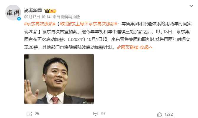 今年9月,继今年年初和年中连续三轮加薪后,JD.COM宣布,自2024年10月1日起,JD.COM零售和职责体系将在两年内实现20工资,其他部门也将陆续启动加薪计划。