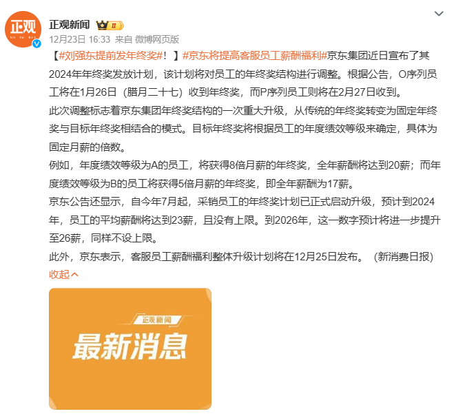 JD.COM的公告还显示,从今年7月开始,采销员工的年终奖计划已经正式升级。预计到2024年,员工平均工资将达到23工资,没有上限。到2026年,这个数字估计将进一步提高到26工资,没有上限。