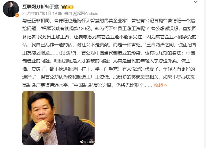 在大多数农民工眼里,提到老板满脑子都是阴险刻薄的恶霸地主形象。这是当今社会的真实缩影。从马云的“996福报”到曹德旺,他宁愿捐100亿也不愿加薪。因为高薪会让年轻人失去奋斗的动力。...大众习惯于从自我角度看企业家“富而不能仁”,所以刘强东的出现似乎让无数人产生了深深的共情。