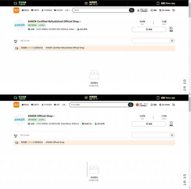 据报道,最近有消息 Temu 输入美国站 "Anker" 关键字搜索只展示第三方商家的一些产品,而蓝标店两个品牌 "ANKER Certified Refurbished Official Shop"、"ANKER Official Shop" 然后显示暂时的休息状态,店内的商品已全部下架。