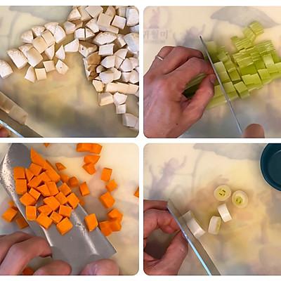 1、杏鲍菇 洗净 切成小丁 莴笋 胡萝卜各自去皮 切成和杏鲍菇一样大小的丁 葱白 切成葱段