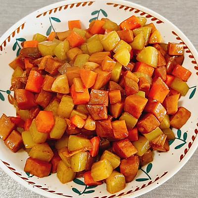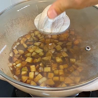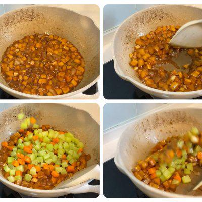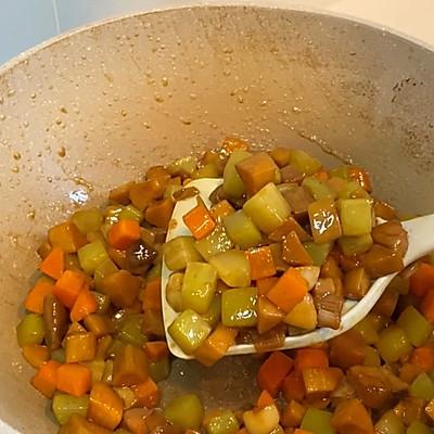 9、把汤炖到锅里粘稠 开盖 转大火 煸炒收汁 汤炒至粘稠 倒入提前炒好的笋丁和胡萝卜丁。 迅速炒匀