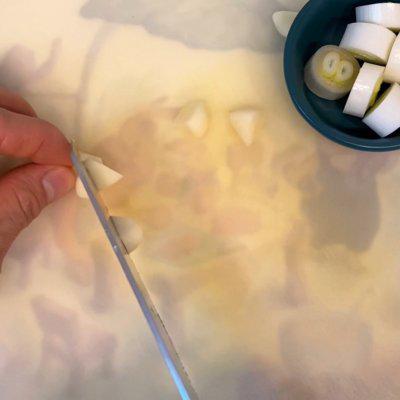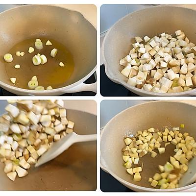 6、再一次在锅里放油 放入葱蒜 炒香 锅里炒成葱香 倒入杏鲍菇丁 大火翻炒 炒至杏鲍菇微微出汤
