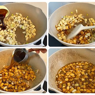 7、杏鲍菇炒塌 倒进腐乳汁 炒匀 酱炒出香味 倒入提前调好的料汁 料汁煮沸