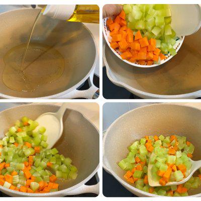 5、炒锅加热放油 油热倒进 生菜丁和胡萝卜丁 大火翻炒 略煸炒 2 分钟 炒至笋丁断生 盛出备用