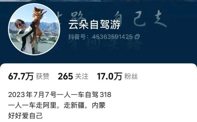 据报道,该网红目前在抖音平台上拥有17万粉丝,个人介绍写道:“一人一车走阿里,走新疆,内蒙古。