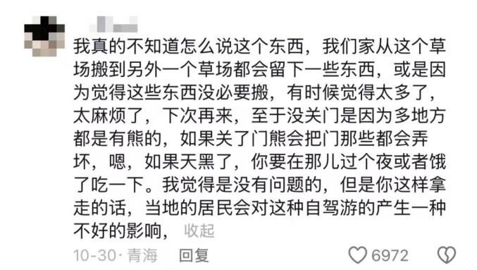 他分析说,管理部门设置的房子大多是板房,博主遇到的房子大概是牧民的房子。“无论是管护站还是牧民家,即使是扔在地上的食材也可能是别人需要的。如果路过的时候遇到困难,可以在房子里吃点东西,但是博主把食物打包带走真的不合适。”