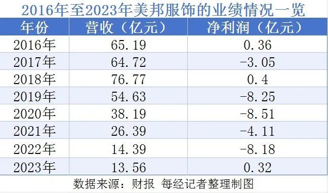 财务报告显示,美邦服装2023年营业收入为13.56亿元,回归母亲的净利润为3175万元。而且从2019年到2022年,美邦服装的利润分别为:54.63亿元、38.19亿元、26.39亿元和14.39亿元;归母净利润分别为-8.25亿元、-8.59亿元、-4.68亿元和-8.23亿元。
