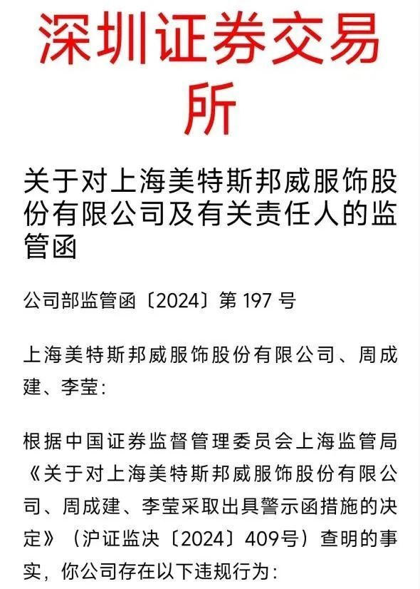 同一天,深交所还向美邦服装发出了《关于上海美特斯·邦威服装有限公司及相关责任人的监管函》。