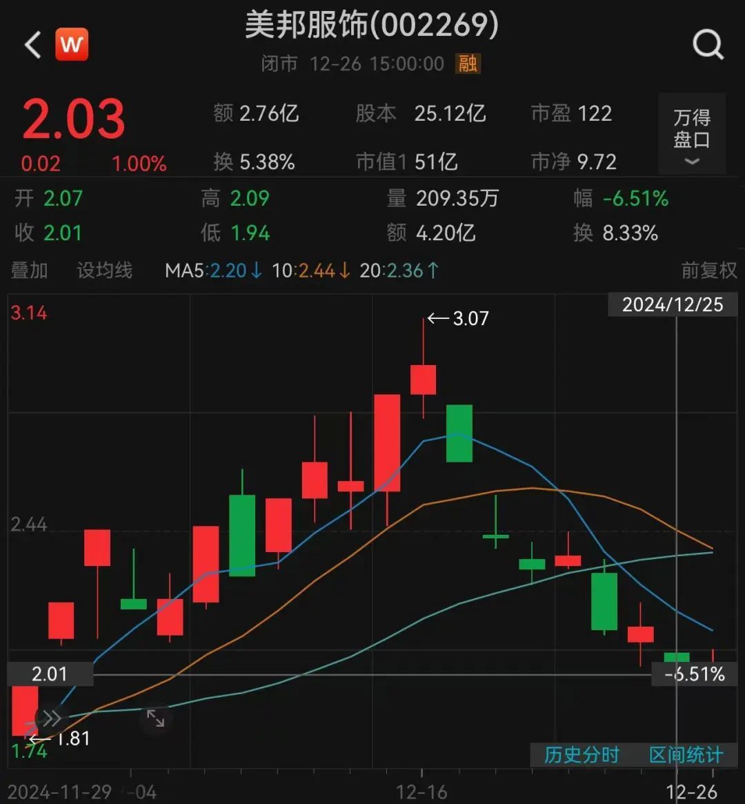 二级市场,公告发布后第二天(即12月25日),美邦服装暴跌6%,盘中一度下跌9%以上。26日,美邦股价上涨1%,收于2.03元。