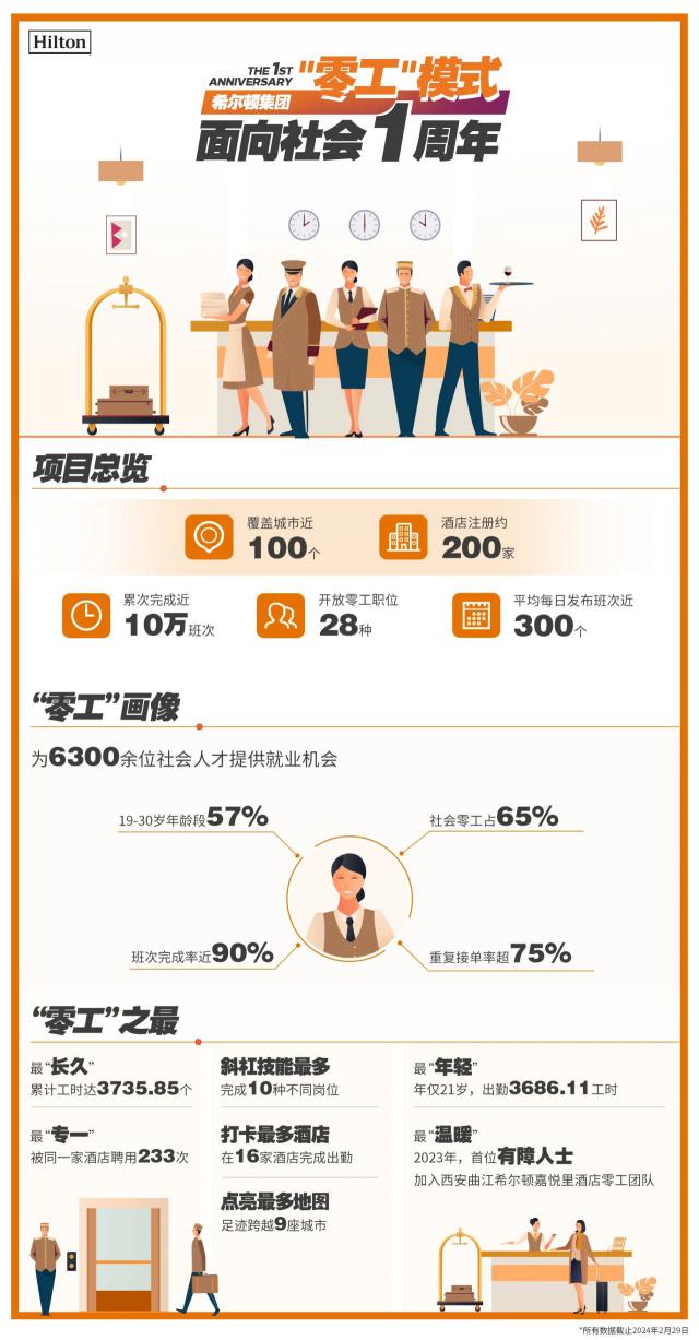 另外一方面,作为国内首家引进“零工” 继希尔顿集团大中华区之后的国际酒店集团模式, 2022 年 9 每月为内部团队成员推出“零工” 试点后 ; 于 2023 每年又开启“零工” 第二阶段,在上海、杭州两个试点城市, 11 酒店为全国人才提供灵活就业机会。现在,希尔顿集团已经在中国 100 座城市 200 每个酒店实行“零工” 方式,到 2024 年 11 月底,“零工” 已经提供了超过项目 35 一万个工作岗位,在处理酒店就业问题的同时,也具有社会效益。
