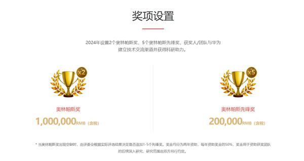 此次设置 2 奥林帕斯奖(奖金) 100 万人民币 / 个),5 奥林帕斯先锋奖(奖金) 20 万人民币 / 个),获奖者 / 该团队将与华为建立行业沟通渠道,并得到科学研究的帮助。