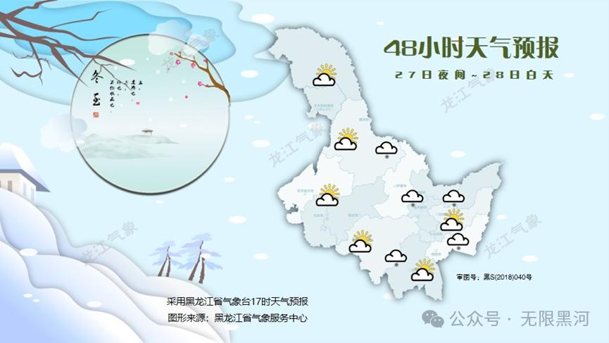 27日晚至28日白天:黑河东部、伊春、哈尔滨东部、鹤岗、佳木斯、鸡西、牡丹江西部阴天有渗透性阵雪,其他地区有时晴朗多云。