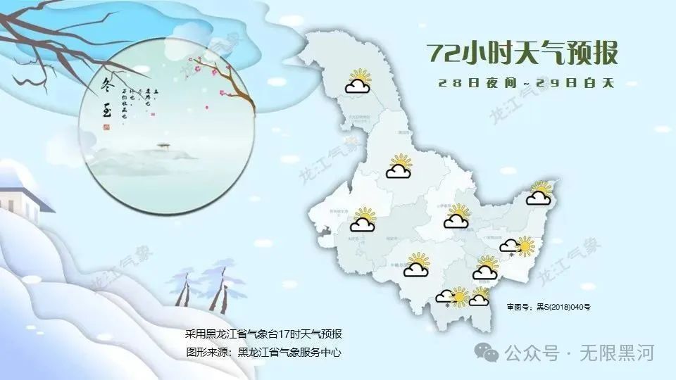 28日晚至29日白天:双鸭山,鸡西东部,牡丹江西部雪转晴,其他地区有时晴多云。