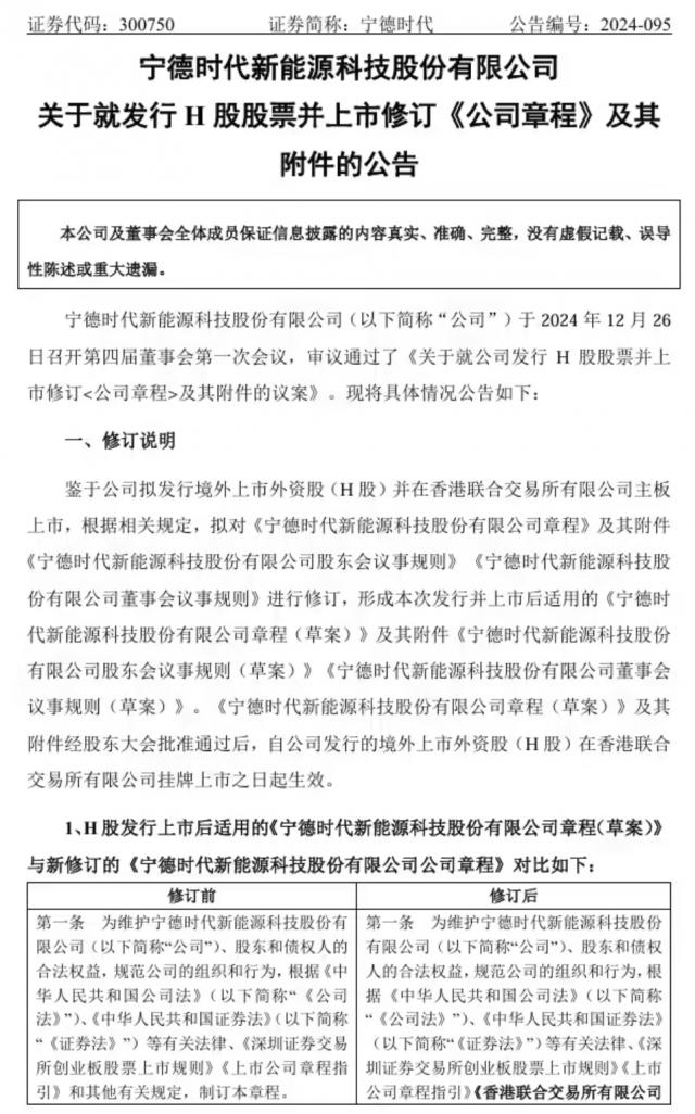 IT 世家 12 月 26 每日消息,宁德时代今日发布公告,公司于 2024 年 12 月 26 第四届董事会第一次会议和第四届监事会第一次会议于日召开,审议通过公司计划发行。 H 在香港联交所上市的股票及相关建议。