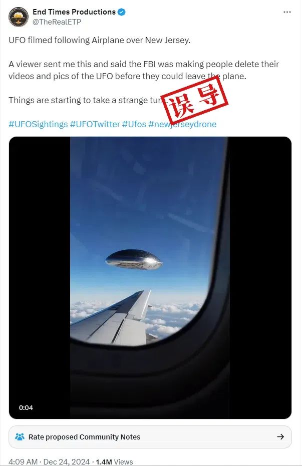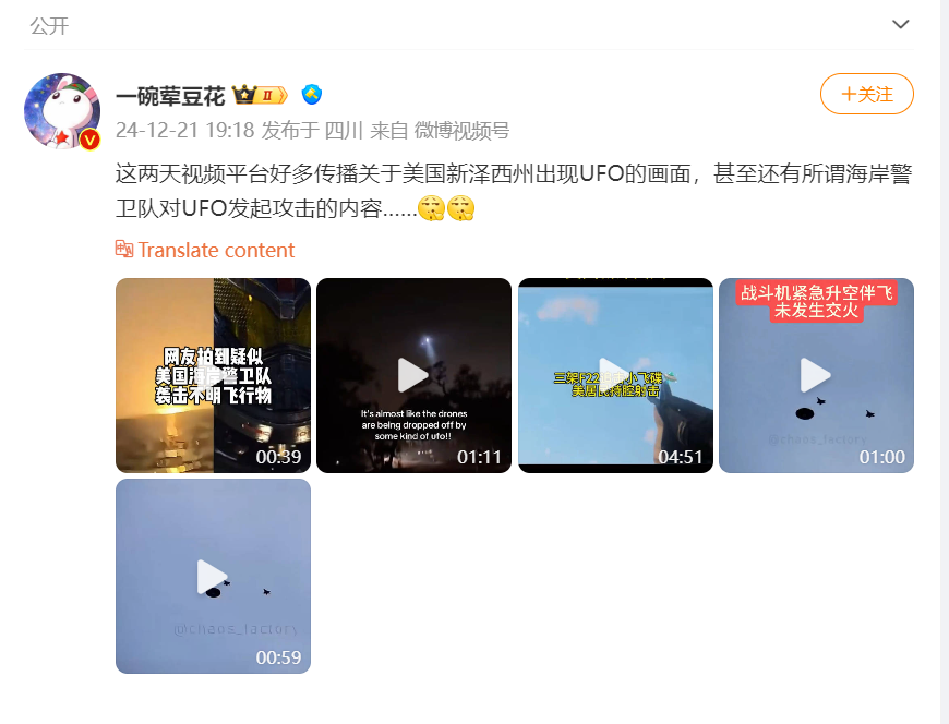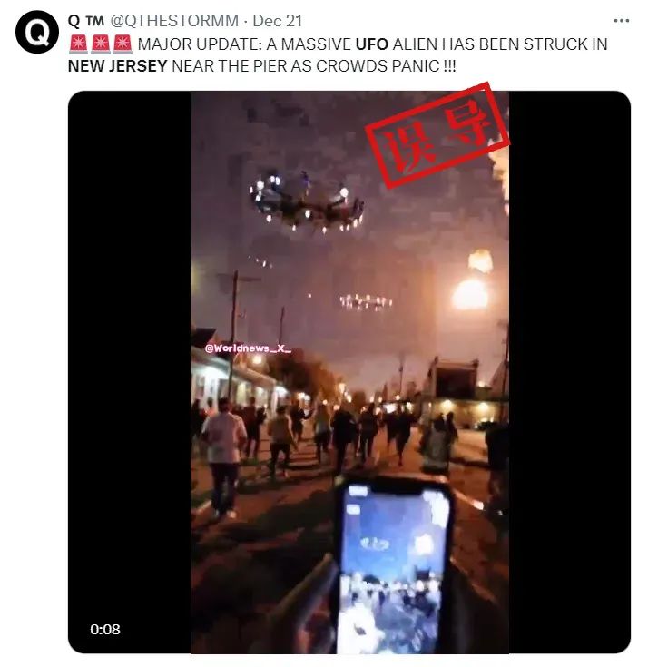 - 社交媒体上流传着大量声称近日在美国新泽西州周边拍摄的不明飞行物的视频,可能套用了旧视频。如果是后期制作或者AI制作,请注意筛选。
