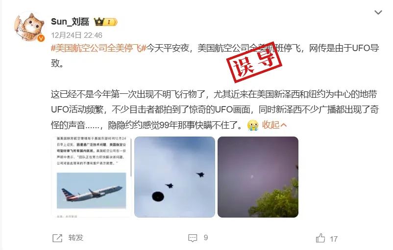 - 12月24日,美国航空公司网爆(American Airlines)停飞航班是由“不明飞行物”引起的。(UFO)由此产生的说法缺乏明确的证据。有关视频已于2023年10月出现,视频疑似采用飞行模拟器加工而成。