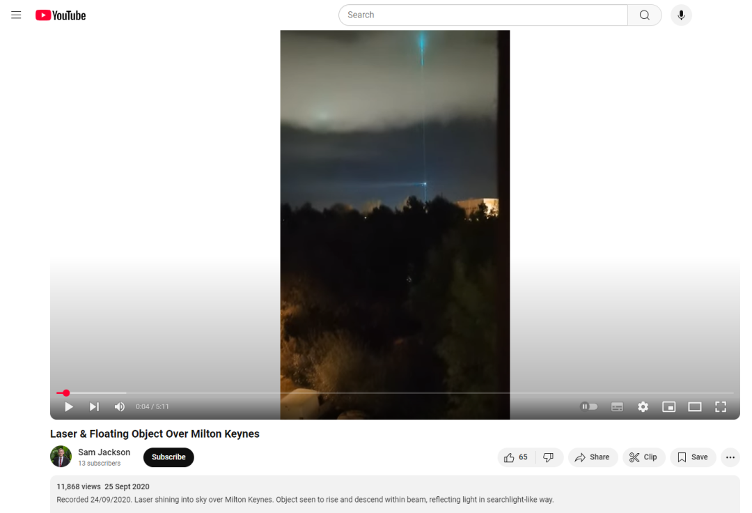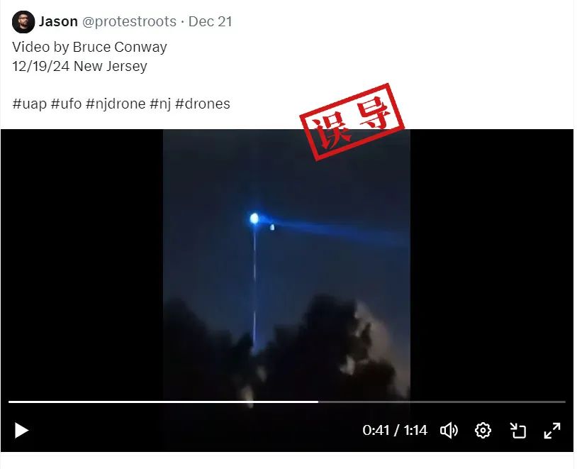 例如,一段自称于2024年12月19日拍摄的新泽西视频实际上出现在2020年9月。视频水平翻转,原始视频场景放大。原始视频拍摄地点位于英国中间城市米尔顿凯恩斯。虽然摄影师没有解释图片内容,但米尔顿凯恩斯的当地媒体报道称,这可能是当地一家科技公司正在进行激光测试。