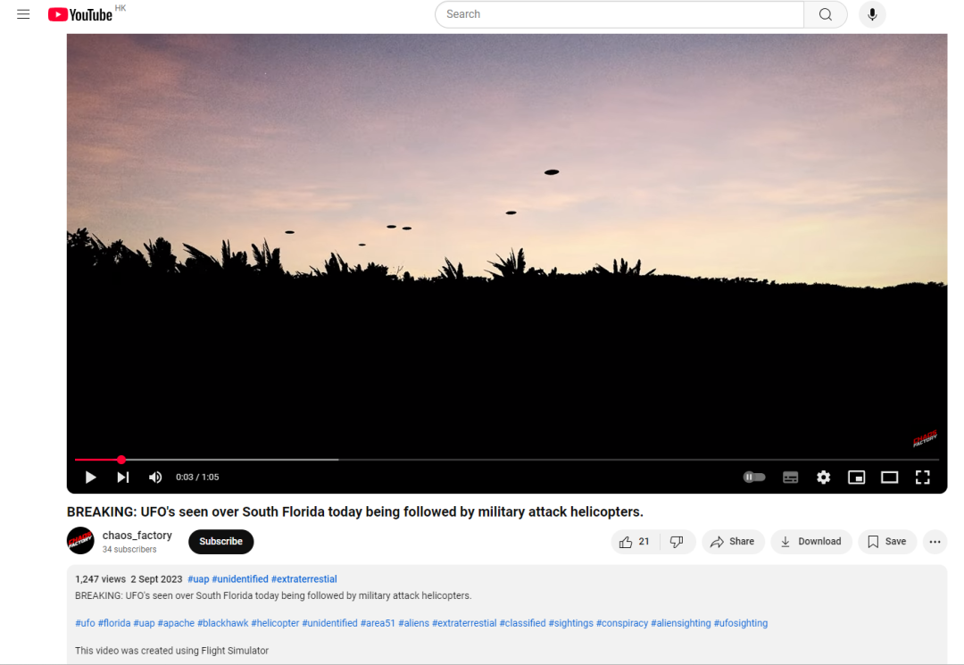 @chaos_factory于2023年9月2日发布了另一段类似风格的视频,也与不明飞行物有关。标题是“突发事件:今天在南佛罗里达上空看到不明飞行物,后面跟着军用攻击直升机”。视频显示,视频是由飞行模拟器制作的,而不是真实的拍摄。