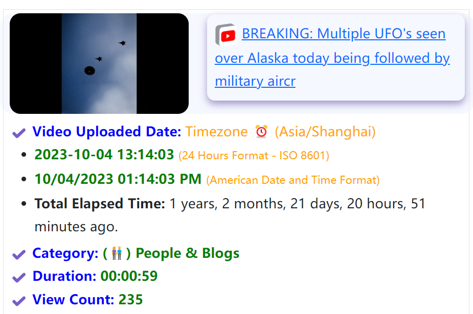 复制视频地址(url)并置于YT larger YouTube 根据Dataviewer的搜索,我们可以发现这个短视频的发布日期是2023年10月4日,作品的标题是“突发事件:今天在阿拉斯加上空发现了许多不明飞行物,被军用飞机追踪”。