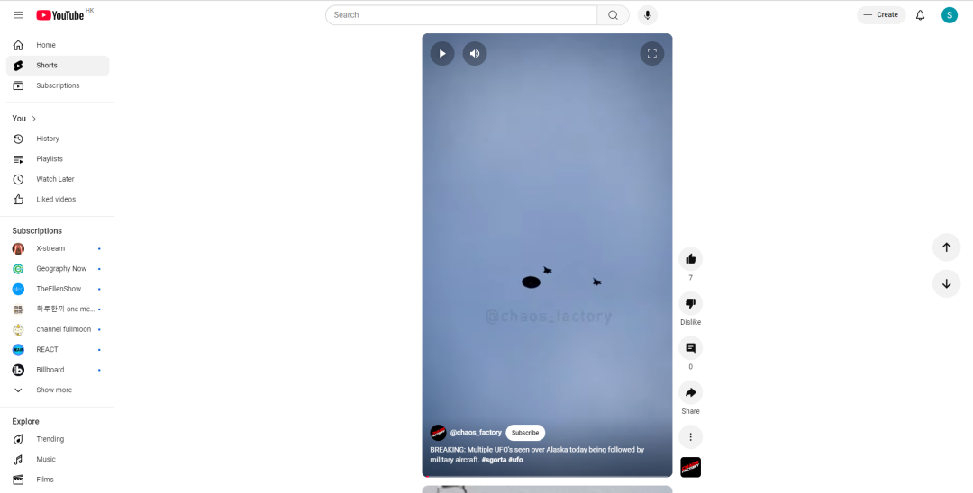 网络爆炸视频画面中心包含@chaos_factory字的水印。搜索“@chaos_factory UFO",可以在Youtube平台上找到一个同名频道,曾经发布过一个类似于网爆视频的短视频。
