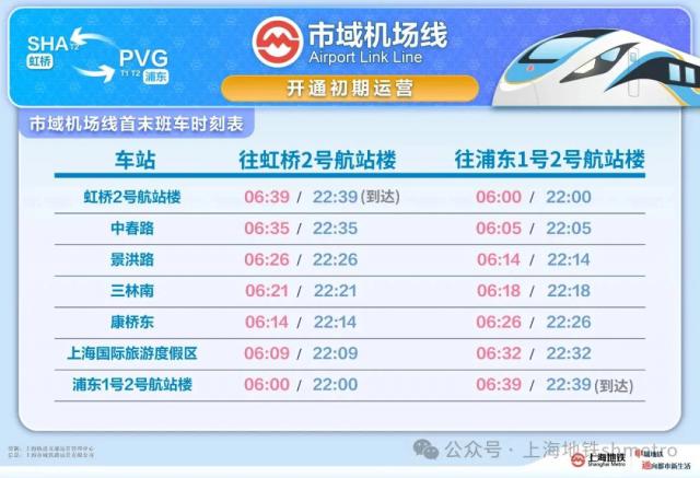 市机场线初期运营线路正常运行时间为 06:00~22:39。虹桥 2 号航站楼站和浦东 1 号 2 号航站楼站第一班车的发车时间都是 06:00;末班车的发车时间都是 22:00。