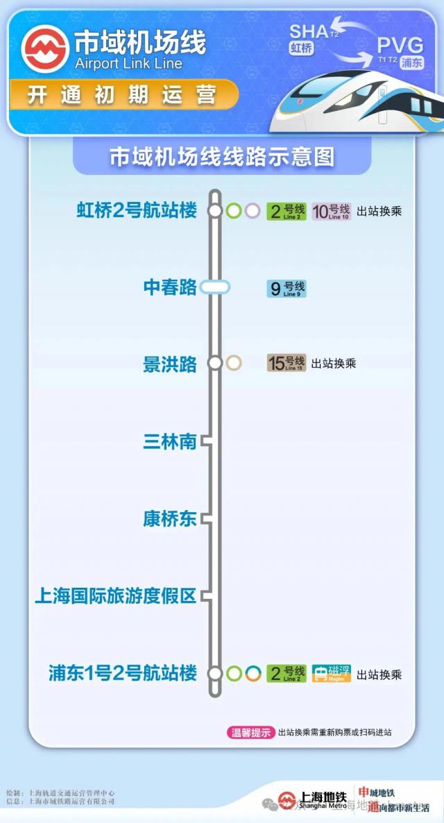 市机场线初期运行里程约约 59 公里,共有站点 7 座(分别为虹桥 2 号码航站、中春路站、景洪路站、三林南站、康桥东站、上海国际旅游度假区、浦东 1 号 2 号航站楼站),其中虹桥 2 中春路站号航站楼站为飞控,其余为地下站。站内换乘车站 1 座位,出站换乘车站 3 座位(出站换乘车站不享受持续收费,需要重新购买车票进站)。