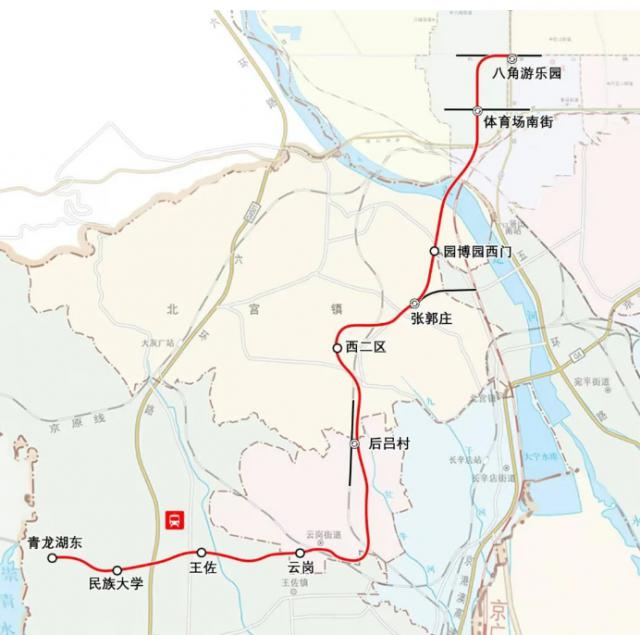 地铁 1 数线支线西起青龙湖东站,北至八角游乐园站,全长约 21 公里,设 10 车站分别为八角游乐园、体育场南街、园博园西门、张郭庄、西二区、后吕村、云岗、王佐、民族大学、青龙湖东。