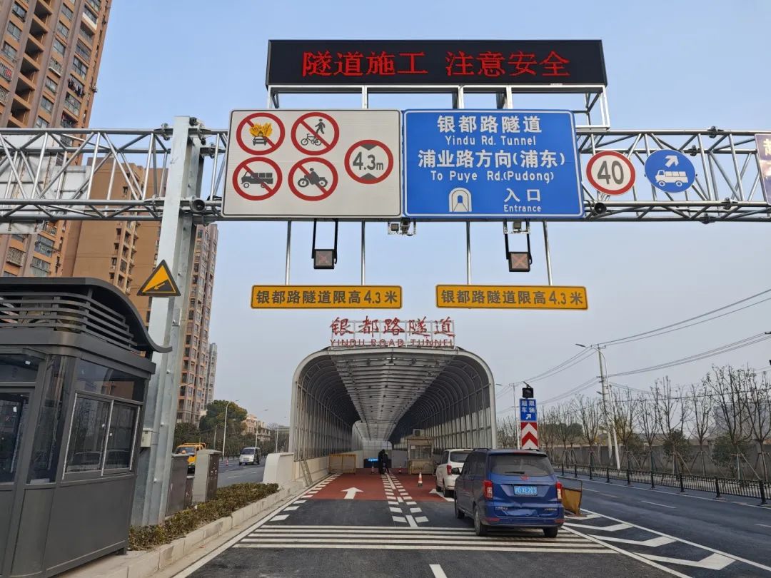 银都路越江隧道新建工程采用“两层隧道”整体方案,上下隧道均为双向4车道规模,按城市主干道标准设计。从徐汇区龙吴路银都路交叉口的隧道入口进入,将在闵行区浦业路芦恒路交叉口的隧道口驶离。这是一条长约1.8公里的上层隧道。从徐汇区景东路银都路交叉口的隧道入口进入,将在闵行区浦锦路芦恒路交叉口的隧道口驶离。这是一条长约2.7公里的下层隧道。标志上明确标明了不同车道的通行方向,居民出行时要看清楚方向。