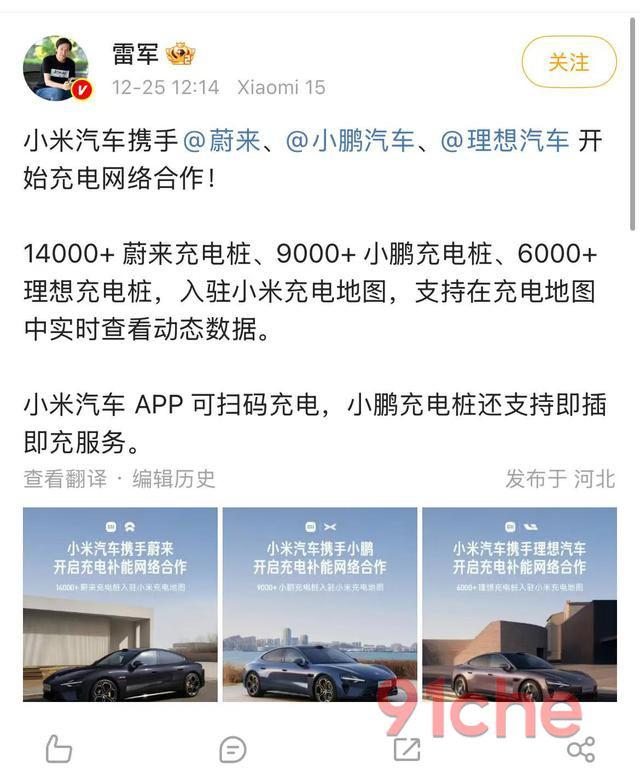 随后,雷军在微博上写道:14000 蔚来充电桩,9000 小鹏充电桩,6000 理想的充电桩,进驻小米充电地图。
