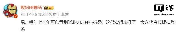 IT 世家 12 月 26 每日新闻,博主 @数码闲聊站 今天爆料说,明年上半年可以看到骁龙。 8 Elite(骁龙 8 至尊版)小折叠,大迭代直接归档。评论区的网友推断小米。 MIX Flip 2。