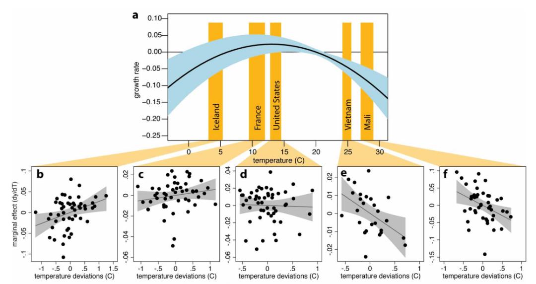 气候对经济发展速度的影响 图源 |“温度对全球经济生产力的非线性影响”