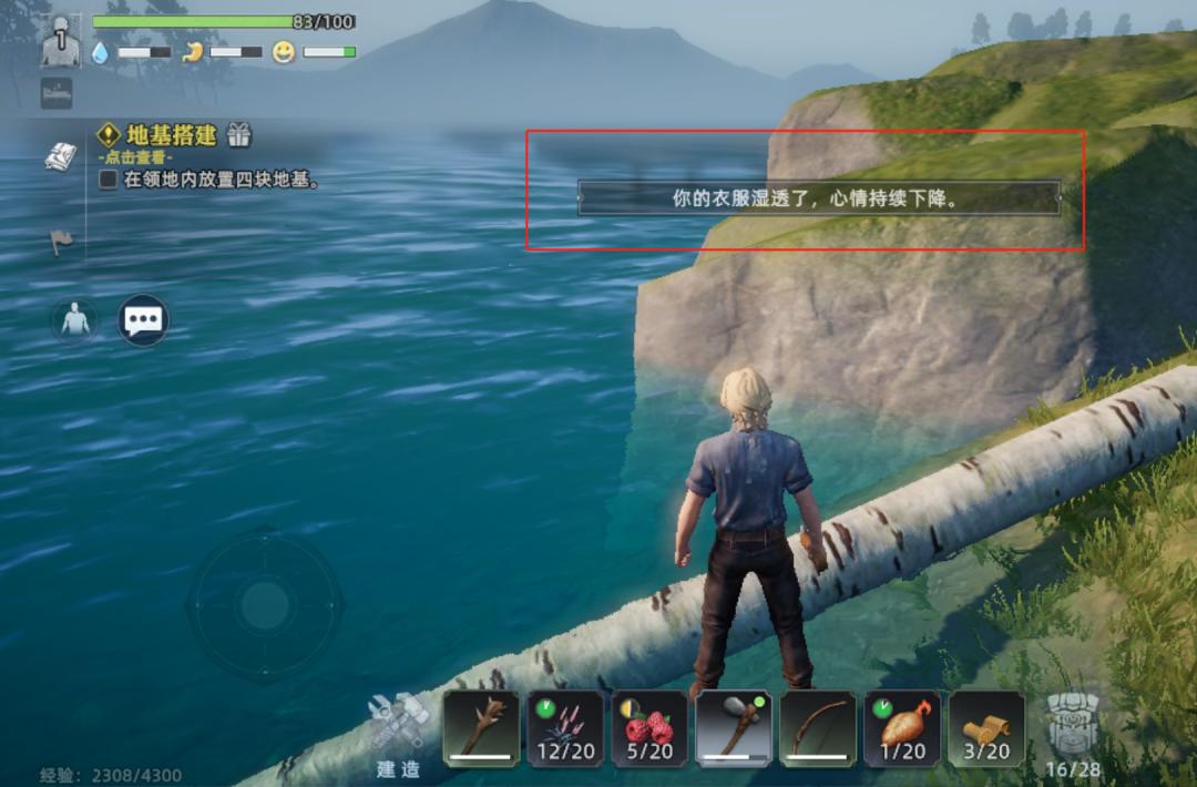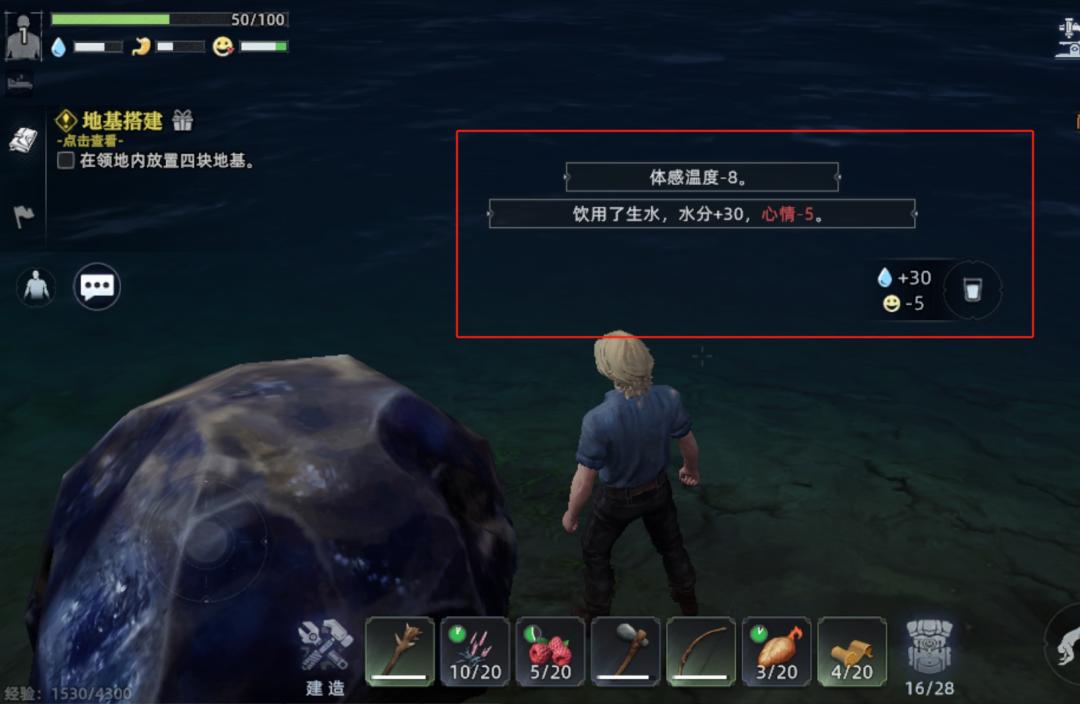 在这方面,玩家的生存指标主要包括三个判断层面:口渴、饥饿和情绪。前两个指标相对常规。当两者的数值较低时,玩家不能冲刺或奔跑。对于“情绪”这个指标,影响变化的因素是多种多样的,也能体现出制作团队的一些乐趣。