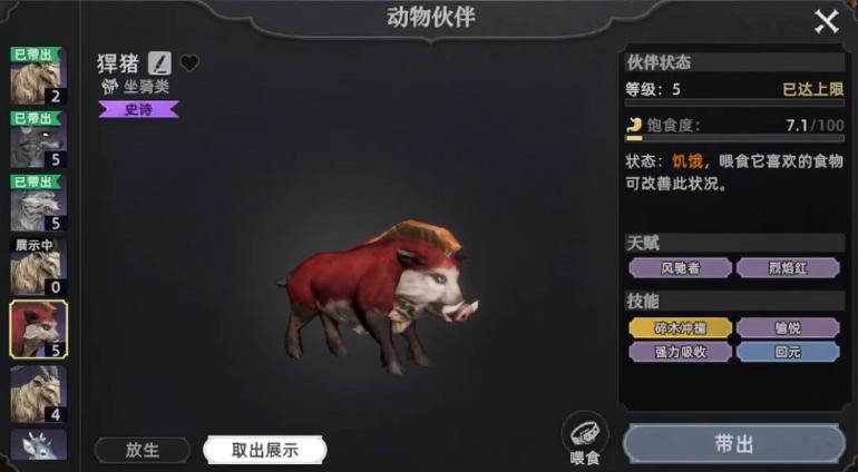 当你带着它们一起在野外探索时,你可以提高它们的水平。不同的宠物有不同的天赋和技能。利用它们各自的天赋和技能,我们可以在探索中事半功倍。比如猪的天赋是风驰者和火焰红,技能是碎木撞击、强回收、快乐和恢复。骑在树上撞击可以快速获得木材。