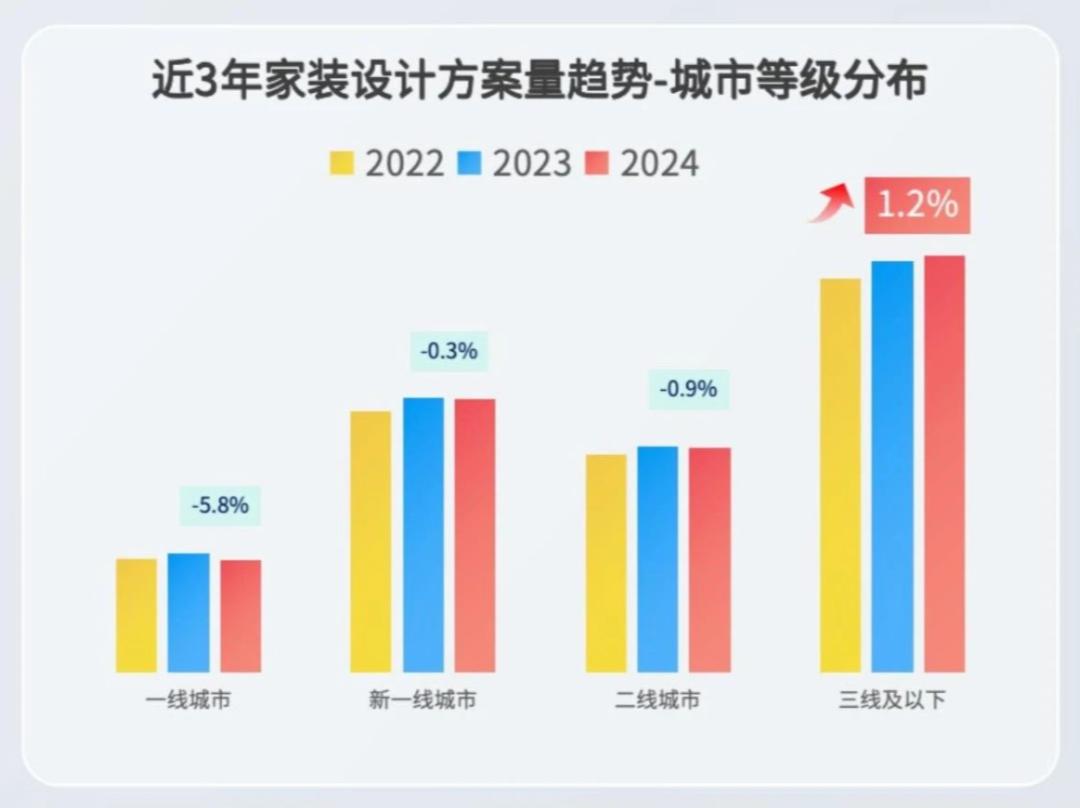 报告显示,随着全国家装设计方案增长乏力,三线及以下城市新增方案数量同比增长1.2%,活跃专业设计师数量同比增长4.1%。这说明随着数字化转型的深入和城市化进程的加快,消费者对家居质量和空间设计有了更多的关注和要求,在更广阔的下沉市场。