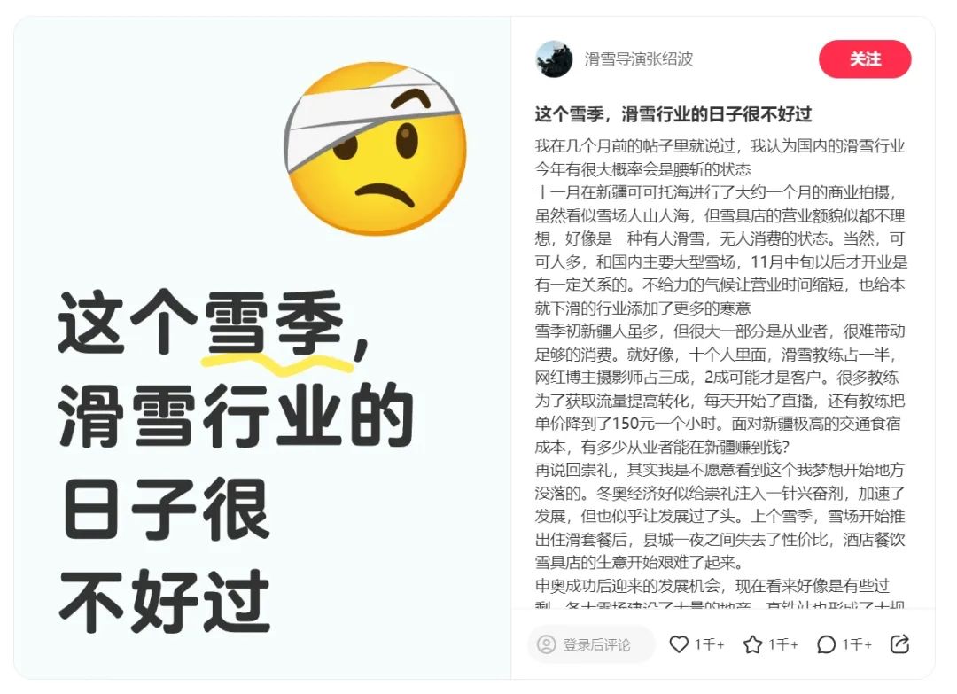 十二月二十三日,曾经拍摄谷爱凌、苏邈鸣的纪录片导演张绍波,在自己的社交平台上发表了一篇帖子,“这个雪季,滑雪行业的日子很艰难”。