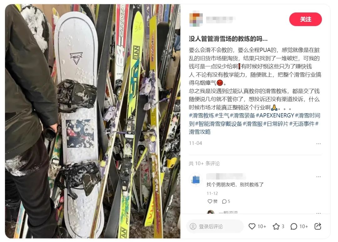 滑雪圈也是如此。对于刚入坑的滑雪初学者来说,滑雪教练市场乱收费,教学不好,甚至很容易直接劝阻客户。前几天刚去崇礼滑雪的时候,对方教练混了很久。一位业内人士也表示,目前国内滑雪教练市场混乱,没有教学资格的野教练很多,专攻0基础教学,费用在300-500元/小时之间。