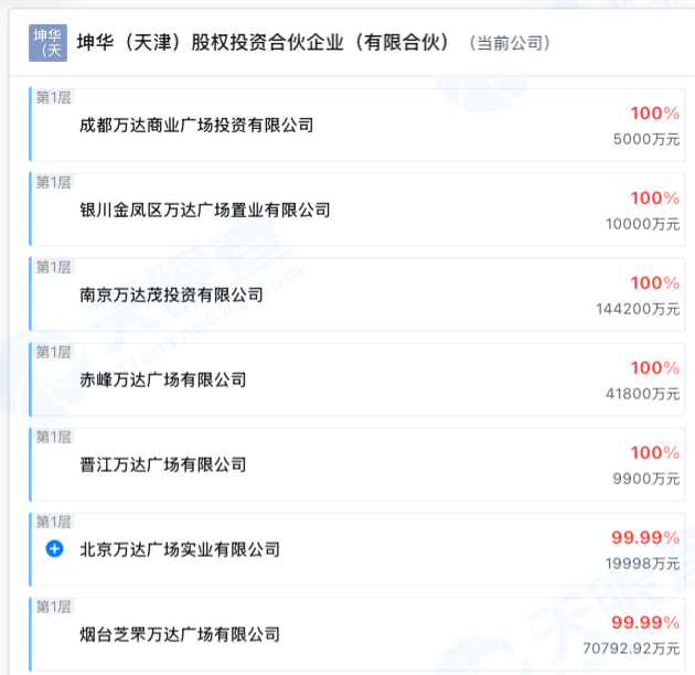 值得注意的是,坤华(天津)股权投资合伙企业(有限合伙企业)注册时间为2023年12月14日,自成立以来已有7次对外投资,均为万达资产收购。
