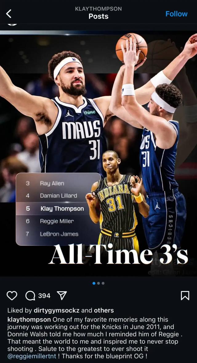 克莱汤普森写道:“在这次旅行中,我最喜欢的记忆之一,就是 2011 年 6 月亮在尼克斯的时候,唐尼沃尔什告诉我,我让他想起了雷吉。这对我来说意味着一切,鼓励我永远不要停止投球。向历史上最伟大的射手致敬!感谢您为年轻一代树立的榜样!"