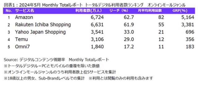 这些年,还有 Temu 、 Shein 这类跨境电商平台也来分一杯羹, Nielsen 资料显示,今年 5 月 Temu 在线客户总数,已冲到日本前五。