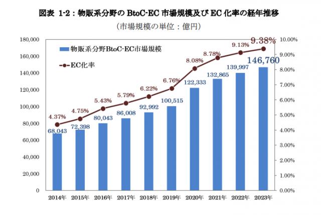 令和和日本经济产业省 5 年度电子商务引导に関する市场调査 》显示, 2023 年度物贩系分野 BtoC-EC (实体产品在线交易 )市场规模有 14 兆 6760 亿日元(约人民币) 6.8 万亿 ),与去年相比有所增加 4.83% , EC 化学率也来了 9.38% 。