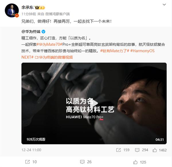 余承东称赞华为Mate 70:兄弟们做得很好 共同寻找下一个未来!