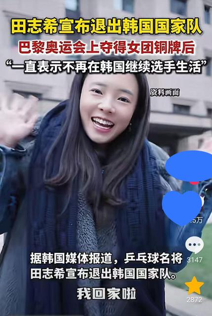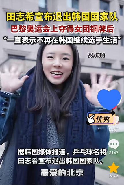 最近,据韩国媒体报道,著名的韩国乒乓球运动员田志希宣布退出韩国国家乒乓球队。然而,当她回到北京时,网上有一段短视频。我看到田志希在短视频中非常高兴地对着镜头大声宣布:我回家了,我最喜欢的北京。