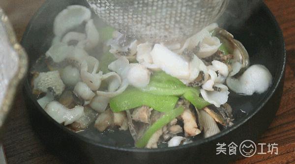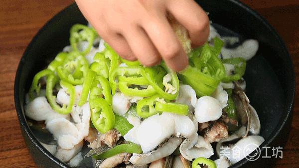 7. 将鱼放入青椒圈和蒜末中,将鱼汤过滤后倒入盘中。