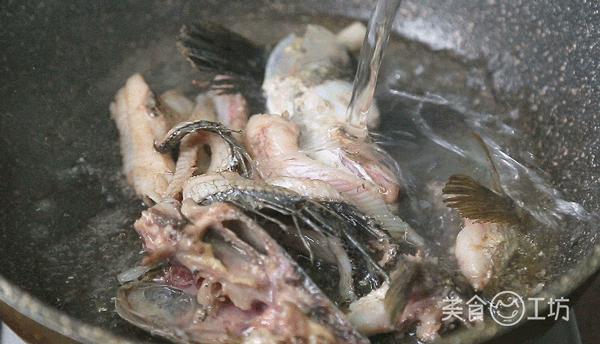 4. 锅中倒入少许油,滑入鱼骨,加入姜片和料酒翻炒,倒入沸水,加入盐调味,转中小火煮至鱼汤变白。