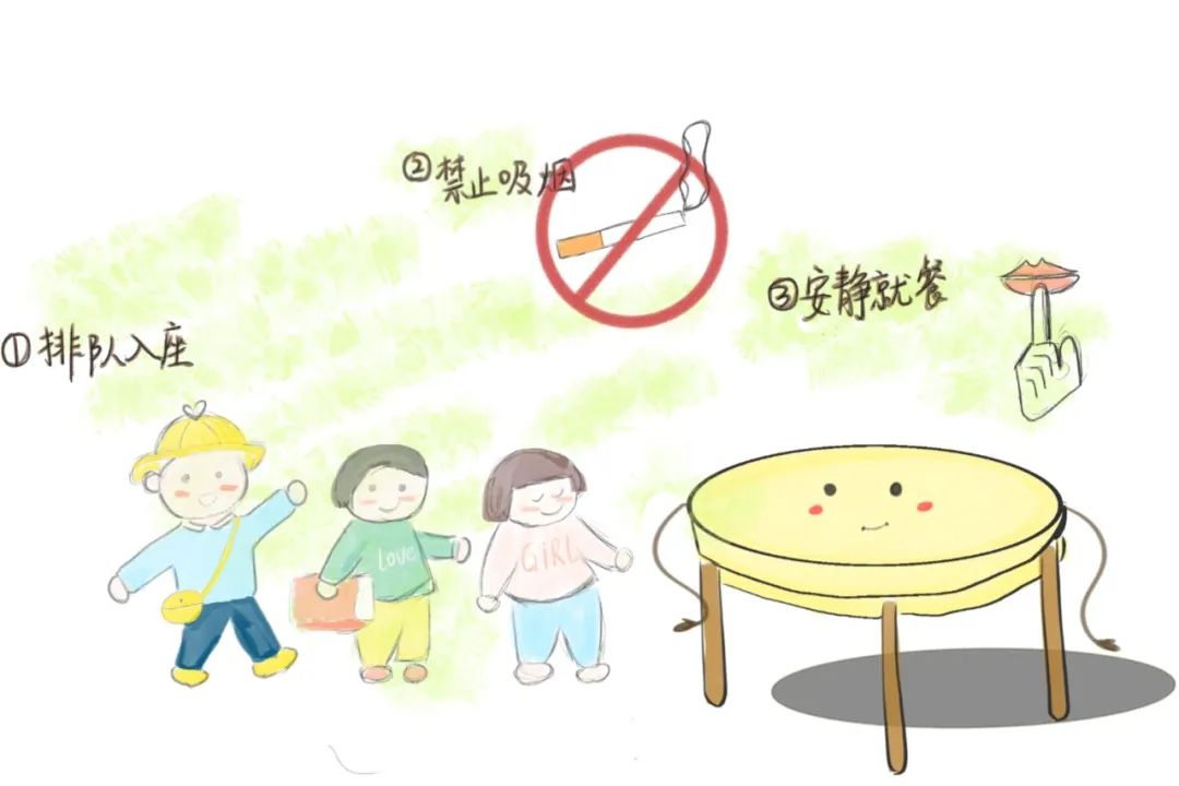 遵循公共道德规范。有意识地排队吃饭,安静地吃饭,注意餐饮卫生,把残渣放进盘子里。不要乱吐,不要在禁烟场所吸烟,不要随地吐痰,不要随意造成用餐环境污染,不要劝酒喝酒,不要开车喝酒,不要酒后开车。