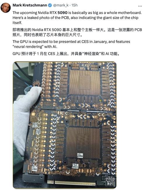 【CNMO 近日,手机中国注意到有外媒在社交平台上发布了一篇关于显卡的文章。 PCB 照片,据报道,这将是英伟达下一代消费级显卡 RTX 5090 的 PCB 板子第一次曝光。从照片上可以看出,RTX 5090 尺寸无法比拟,显示出其强大的性能潜力。