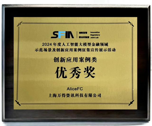 与此同时,AI ⁺“万得投顾终端” Wind AliceFC “2024年,由上海金融科技产业联盟创新监管联合实验室主办, 在年度人工智能大模型金融行业示范场景和创新应用案例征集宣传展示活动中,获得创新应用案例优秀奖。这一荣誉不仅肯定了团队的不懈努力和创新精神,也预示着广阔的市场前景和机遇。