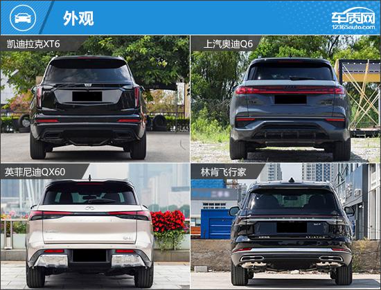在汽车的后部,四款车的整体视觉效果非常饱满大气,与其豪华中大型车型。 SUV 位置一致。奥迪 Q6 与林肯飞行家选择了贯穿式尾灯组,具有很强的现代感,可以增加尾部的层次感。英国和菲尼迪 QX60 尾灯形状狭长,与前灯风格统一。凯迪拉克 XT6 选择家族化的 L 形状的尾灯组,提高了汽车的识别度。